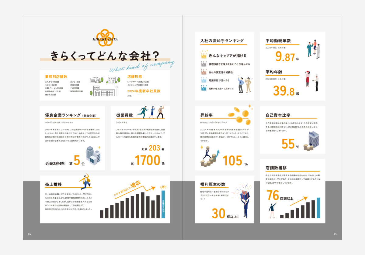 制作にあたっては、同社の強みである「安定した経営基盤」と「長所伸展を掲げる教育方針」をメッセージの軸に据えました。安心してキャリアを積める環境をしっかりと伝えるために、平均勤続年数の長さなど裏付けとなるデータを整理し、デザインとしてわかりやすく可視化しています。また、表紙を含め社員の表情写真を多く取り入れることで、一人ひとりがいきいきと働く姿を前面に打ち出し、冊子全体を通して「安心して挑戦できる環境」という印象を感じてもらえるデザインに仕上げました。