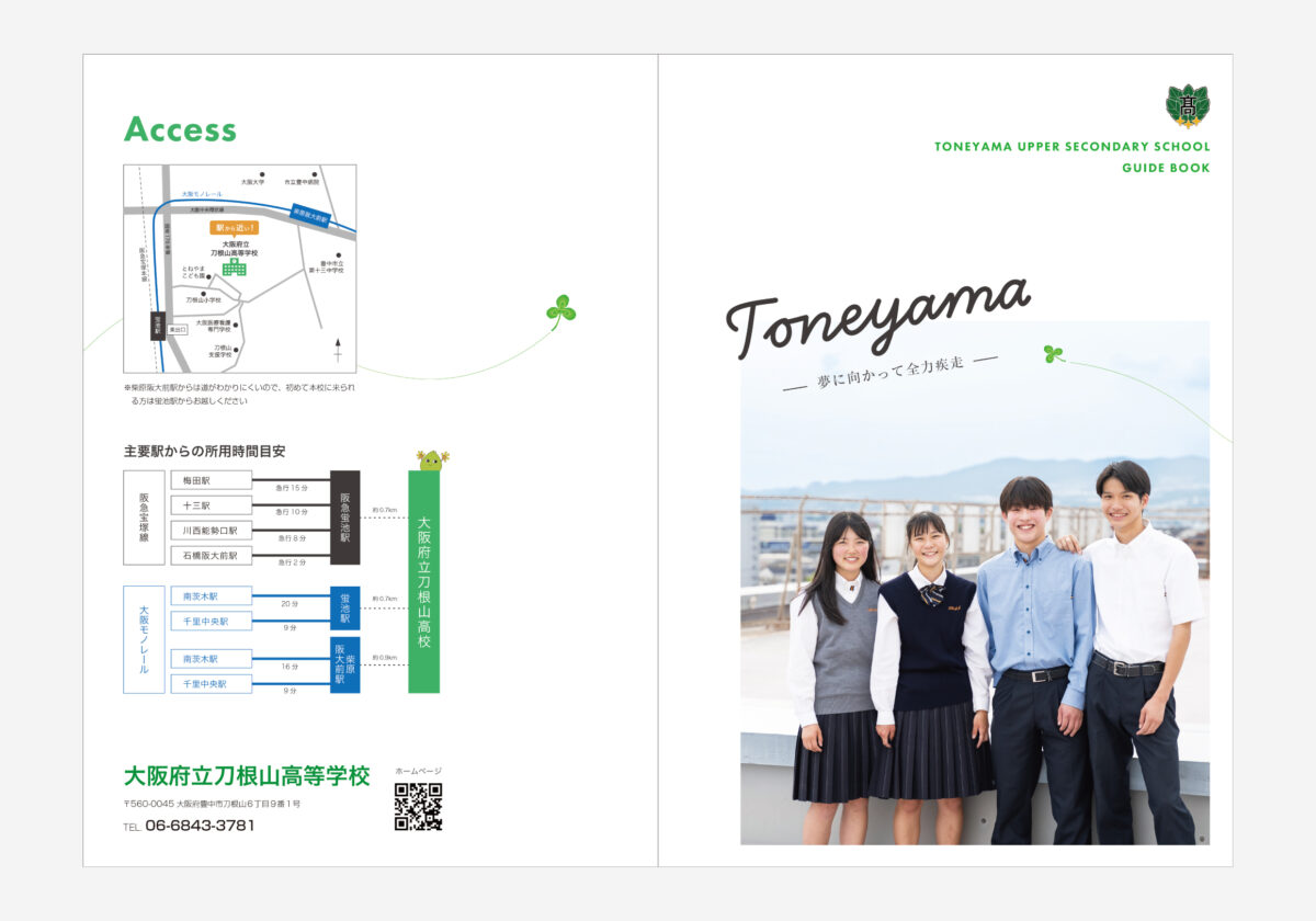 大阪府立刀根山高等学校様では、志望者数の減少こそないものの、この先に生徒数が減少していくことを見据え、より学校の特徴を伝える必要があるという危機感をお持ちでした。しかし、学校説明会や中学への配布には10年近く前に作成された学校案内パンフレットを使用していたため、情報が古く、今の時代に合っていない表現も多く掲載されていました。「古くなったデザインを一新してイメージを良くしたい」「学校の特徴を伝わりやすくしたい」といった課題を抱えておられました。