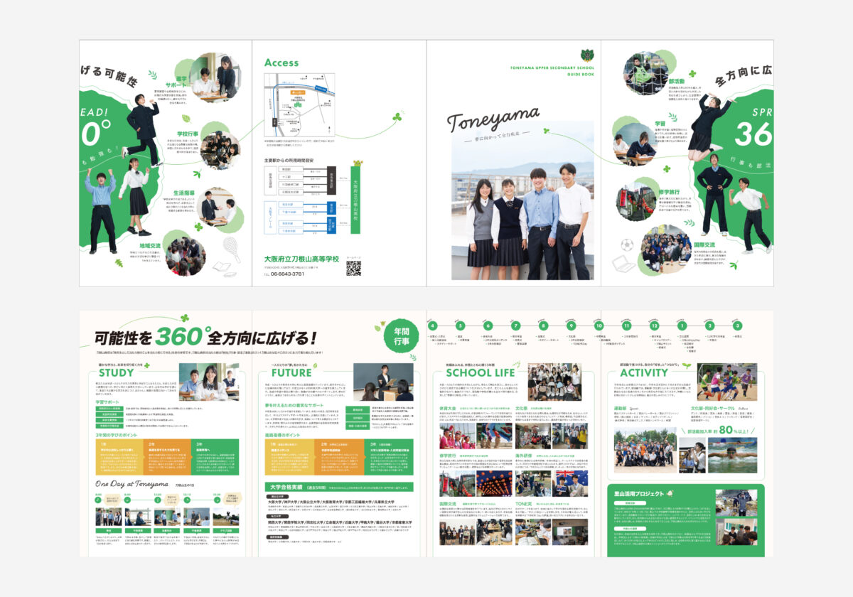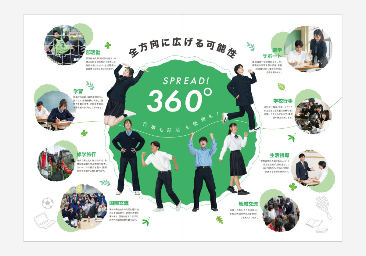 「目立った特徴がない」とのお話もありましたが、学習指導・生活指導・進路支援・部活動・国際交流など、どの分野においても平均以上の環境を提供されている点に着目。そこで、「専門性を極める学校」ではなく、「将来に向けてあらゆる力をバランスよく伸ばせる学校」というポジションを明確化しました。この考えをもとに「360度、全方向に広がる可能性」というメッセージをコンセプトとして設定。どの方向にも伸びていける自由度と成長のイメージを、デザインとコピーの両面で表現しています。