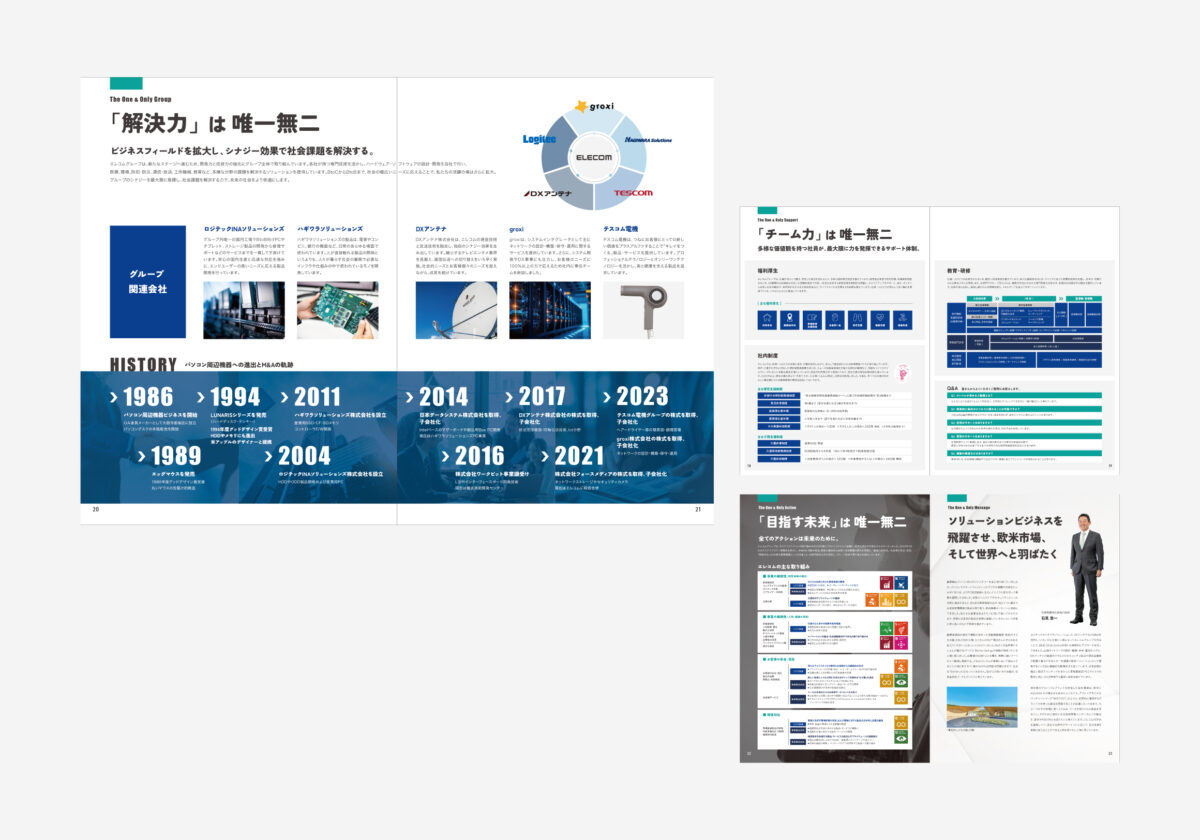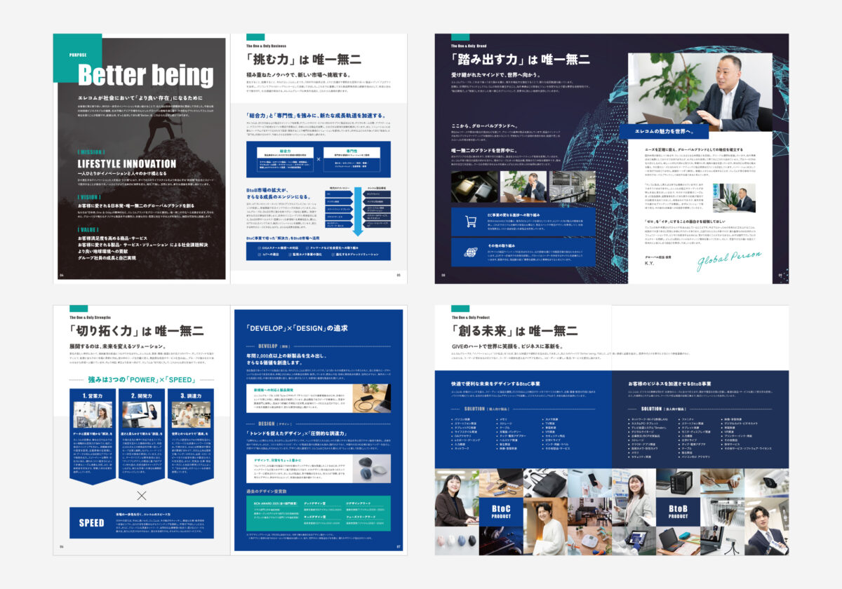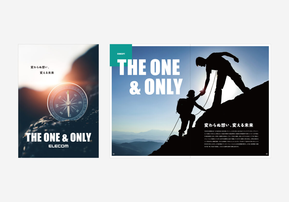 各ページでは「唯一無二」という言葉を取り入れたキャッチコピーを展開し、創業当初から受け継がれてきた想いをメッセージとして表現しています。デザイン面では、「前だけを見て、常に成長し続ける」という姿勢をチームで山頂を目指すストーリーとして表現。力強いフォントや、洗練されつつ希望を感じさせる配色で、前向きに挑戦を続けるエレコム様らしさを表現しました。