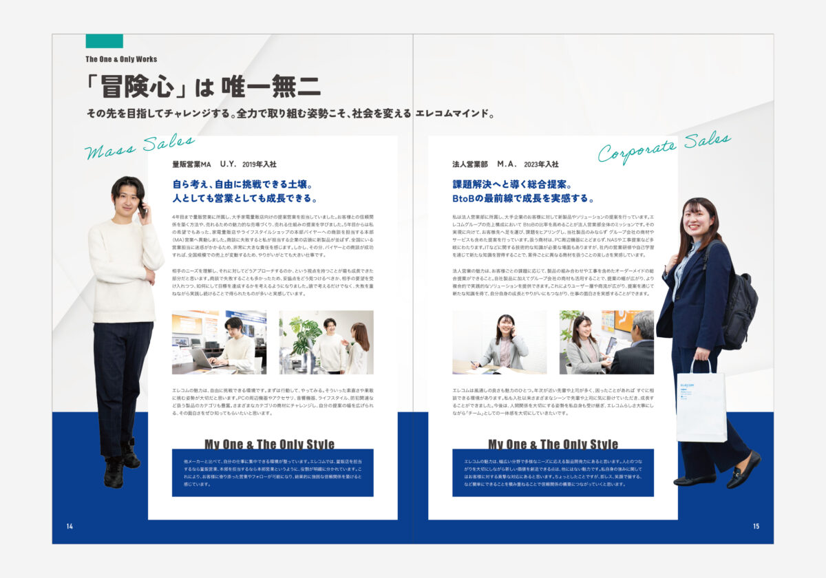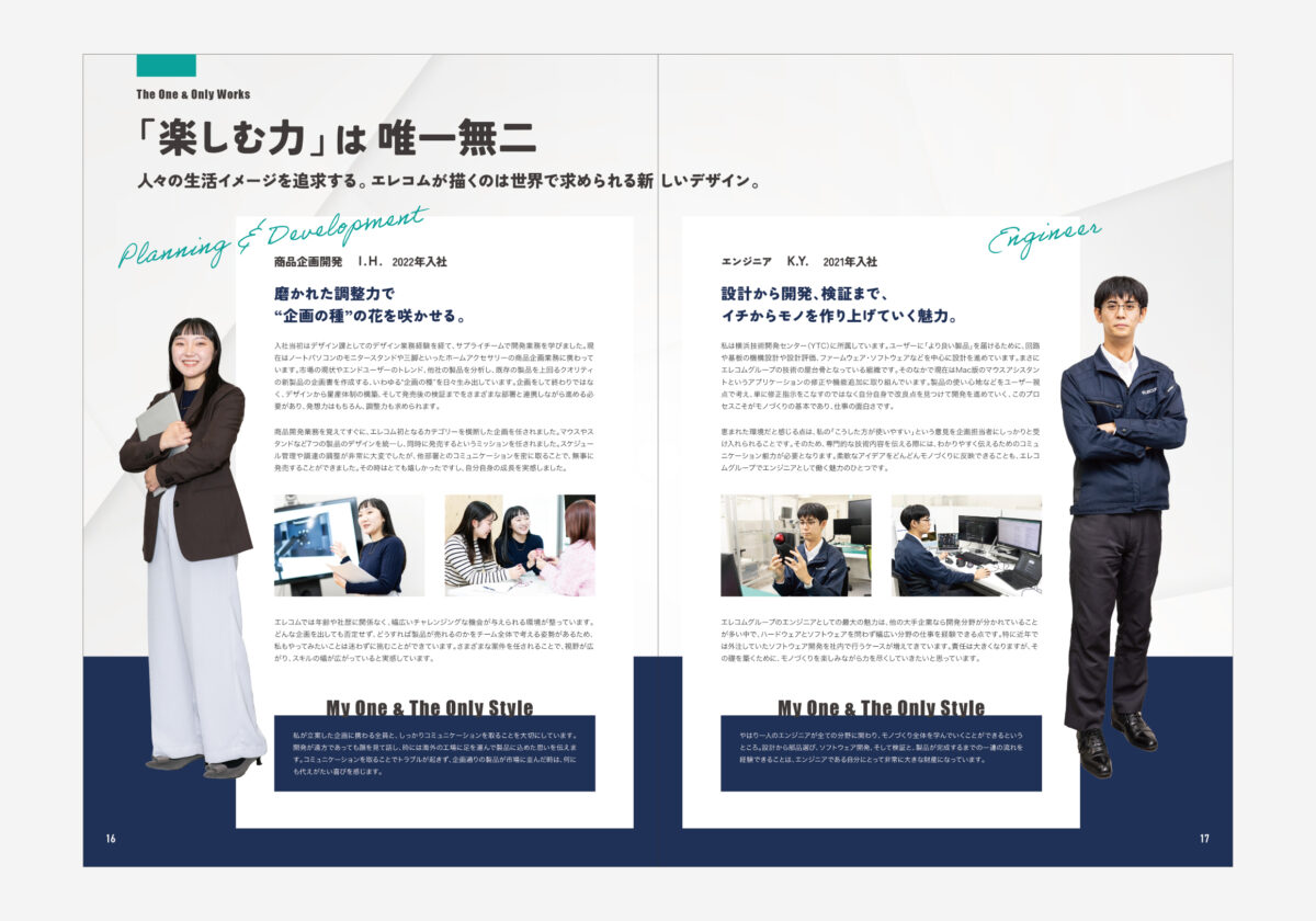 採用パンフレット制作において豊富な実績を持ち、デザインだけでなく企画構成やコピーライティングまで一貫して対応できる点をご評価いただき、エレコム様の人材採用コンサルティングを担当されている代理店様よりご相談をいただきました。