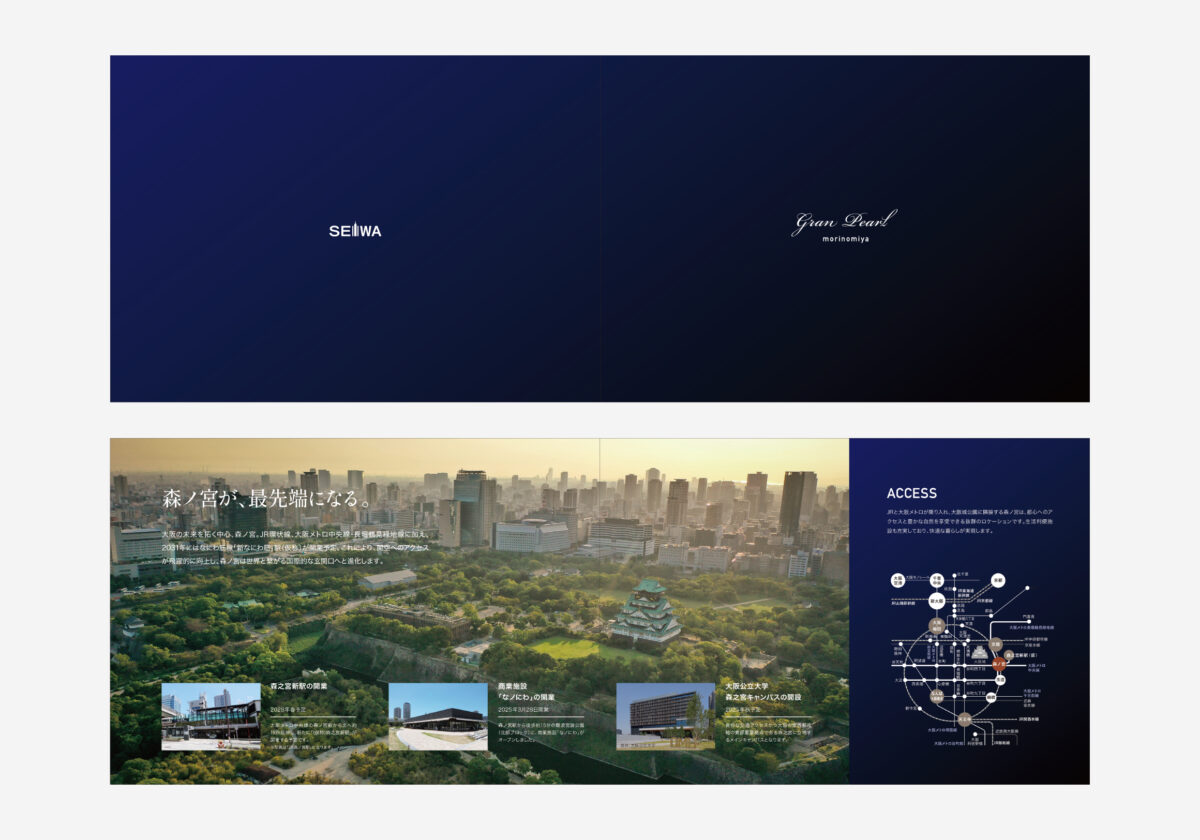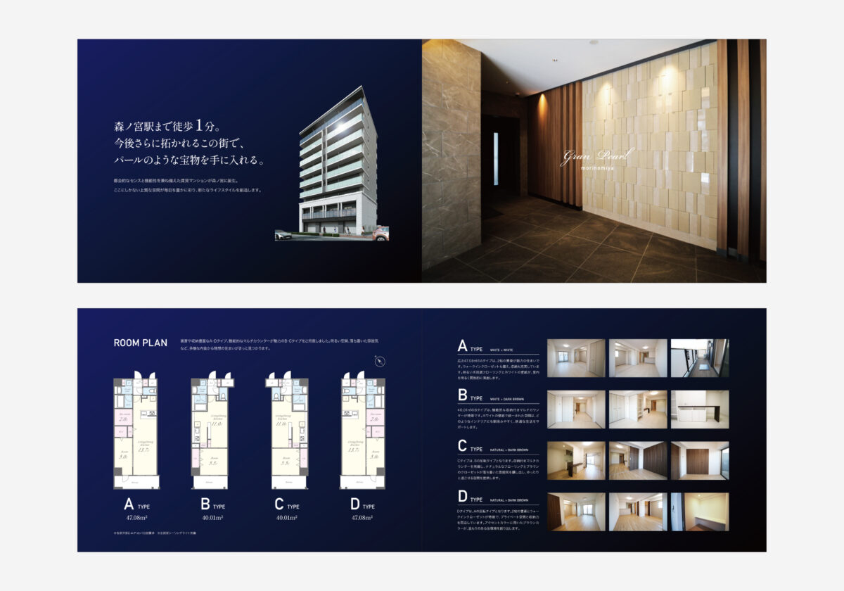 パンフレットは、営業担当者が説明時に使用する場面や、入居希望者が手に取る瞬間など、触れた時の印象も重要なデザイン要素です。私たちは紙の質感も含めて、「ブランド体験」としてご提案いたします。今回は、建物の持つ上品さ・利便性・洗練された世界観を一冊のパンフレットで表現できました。結果として、販売担当者にも入居希望者にも、マンションの価値をより強く感じていただける仕上がりとなりました。