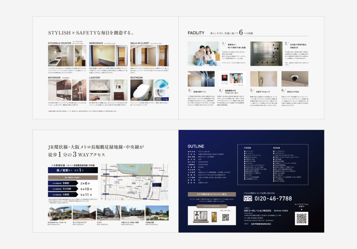 生和不動産保証株式会社様では、これまでも多くの賃貸マンションパンフレットを制作されてきましたが、従来のデザインでは十分に表現しきれなかった建物の特徴や世界観を、より効果的に伝える新しい見せ方が求められていました。賃料帯も決して安くはないため、入居希望者に「高品質で上質な暮らし」を感じてもらえる、重厚感と品格のあるデザインが必要とされていました。