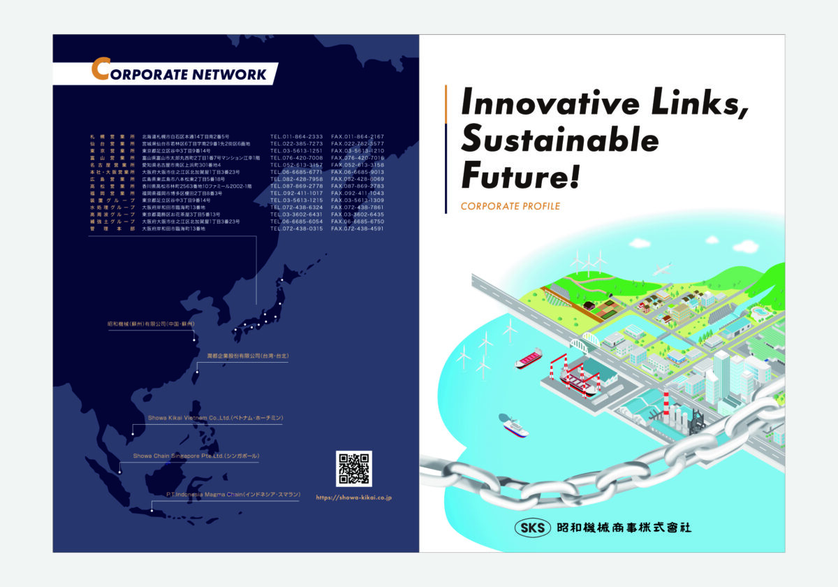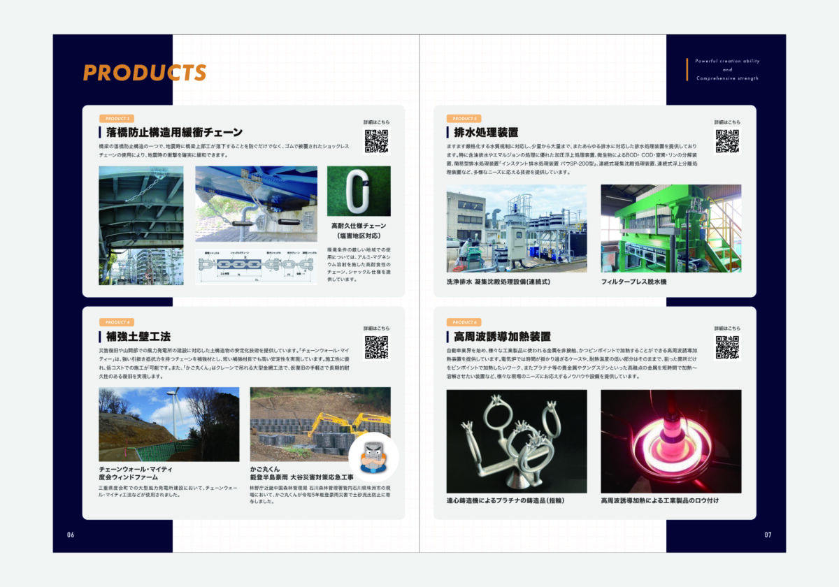 パンフレットの表紙デザインは非常に重要です。表紙では2エリアを統合したイラスト上に主力製品であるチェーンを配置し、「社会を支えるチェーンメーカー」という独自性を強く印象づけました。また、会社案内はイメージだけでは完結しません。後半では各事業を具体的な写真とともに整理し、商談の場でそのまま活用できる“営業ツールとしての完成度”を重視しています。