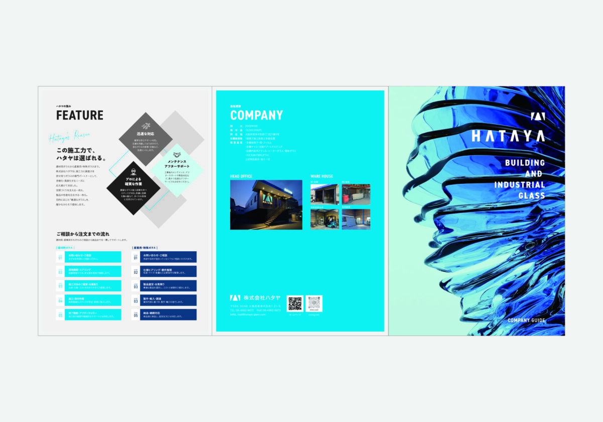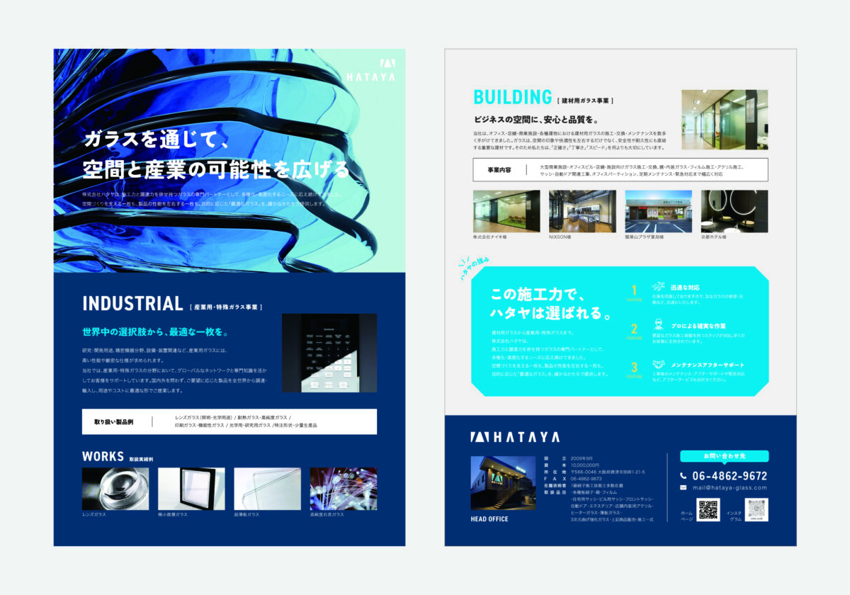 株式会社ハタヤ様は、大阪・関西を中心に、オフィス・店舗・商業施設などにおける建材用ガラスの施工・交換・メンテナンスを数多く手がけてこられた企業です。今回、事務所移転およびオフィスリニューアルのタイミングで、会社案内パンフレットの刷新についてご相談をいただきました。